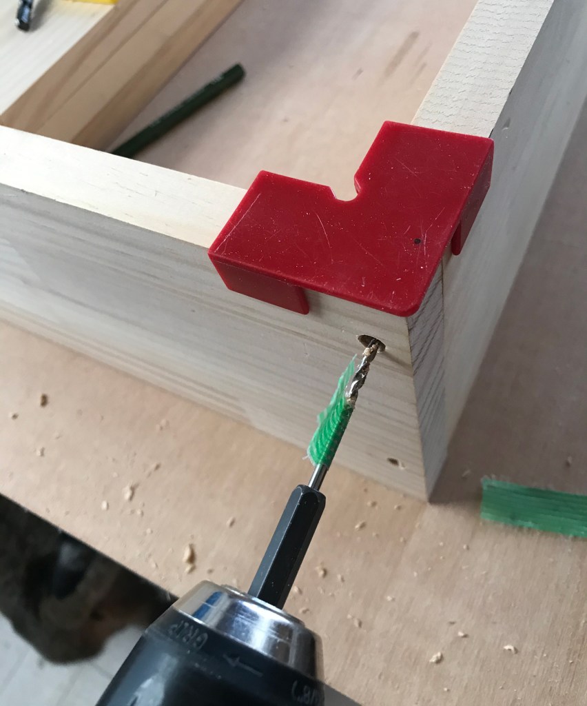 この木材同士を仮止めしている赤いクリップみたいものは、百均で売っている優れもの。
