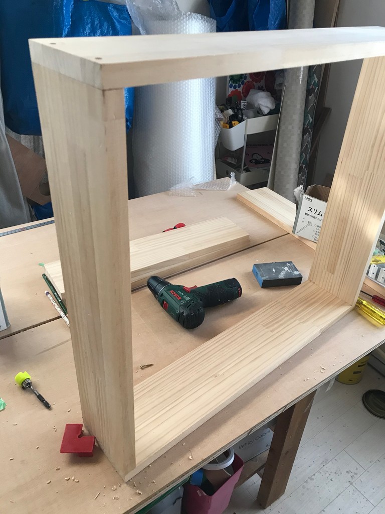 1つだと幅が足りないので、ふたつくっつけてしっかりした台にします。