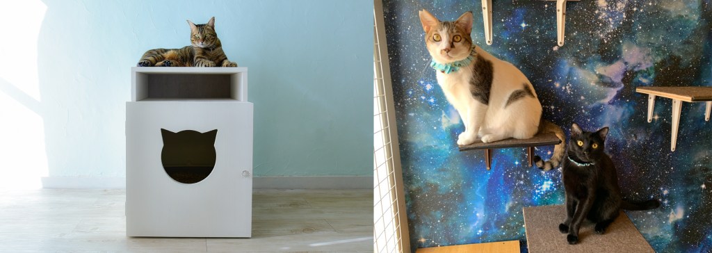 制作した猫用インテリアをカフェで実物が見れるように
