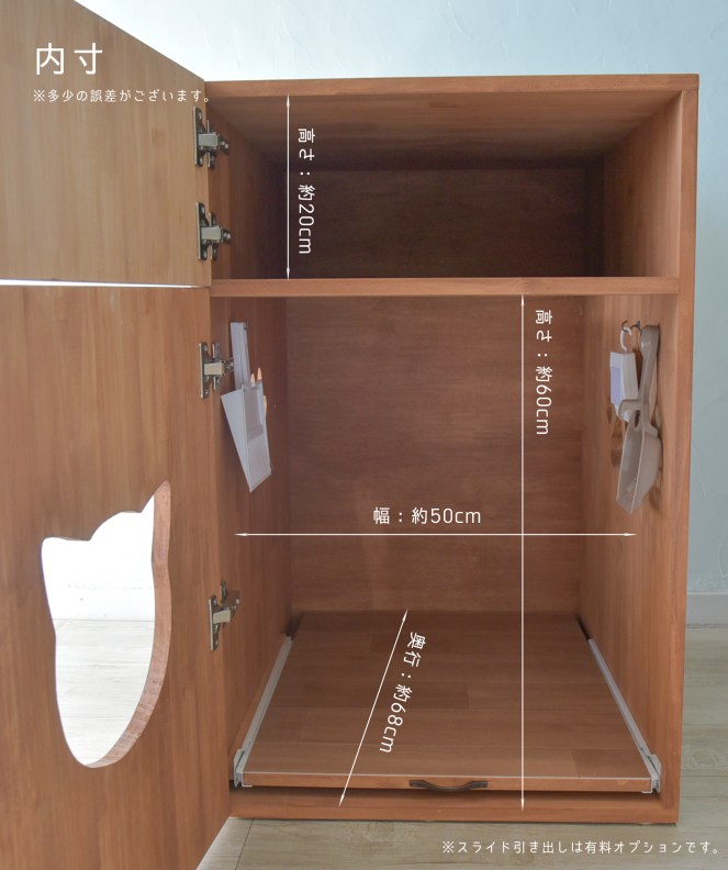 スライド引き出しをつける場合は、幅がプラス3cm、奥行きは約2cmプラスになります。