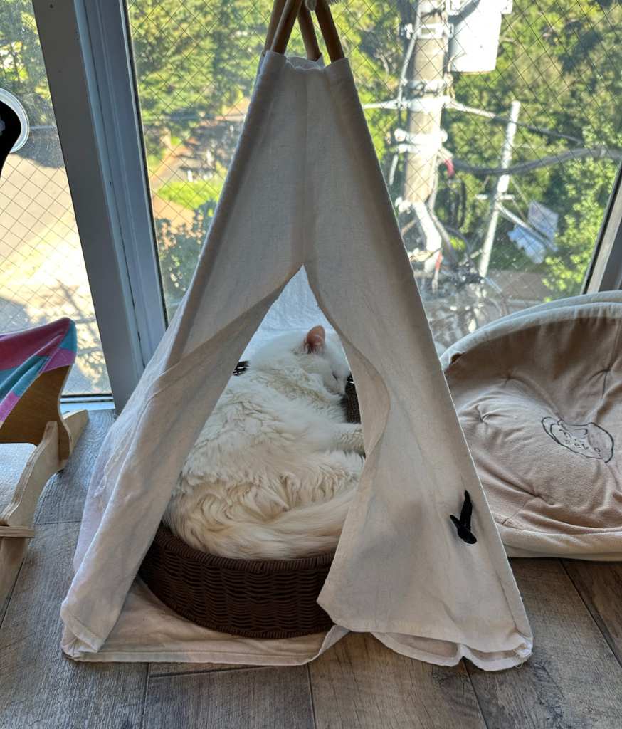 おしゃれなテントで寝るおしゃれな白猫ちゃん。