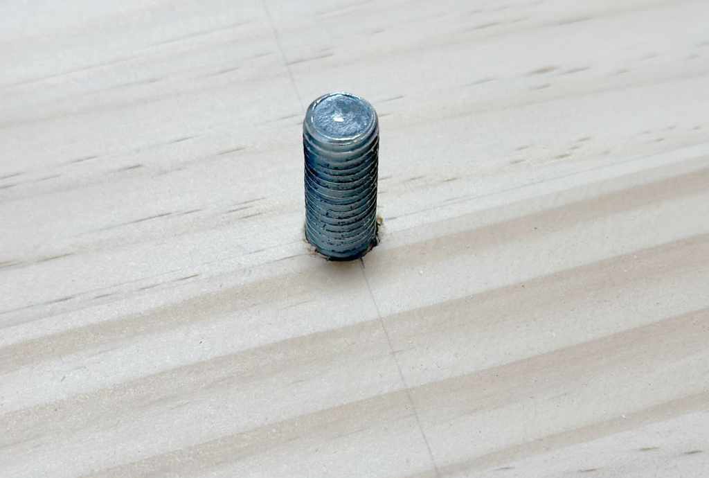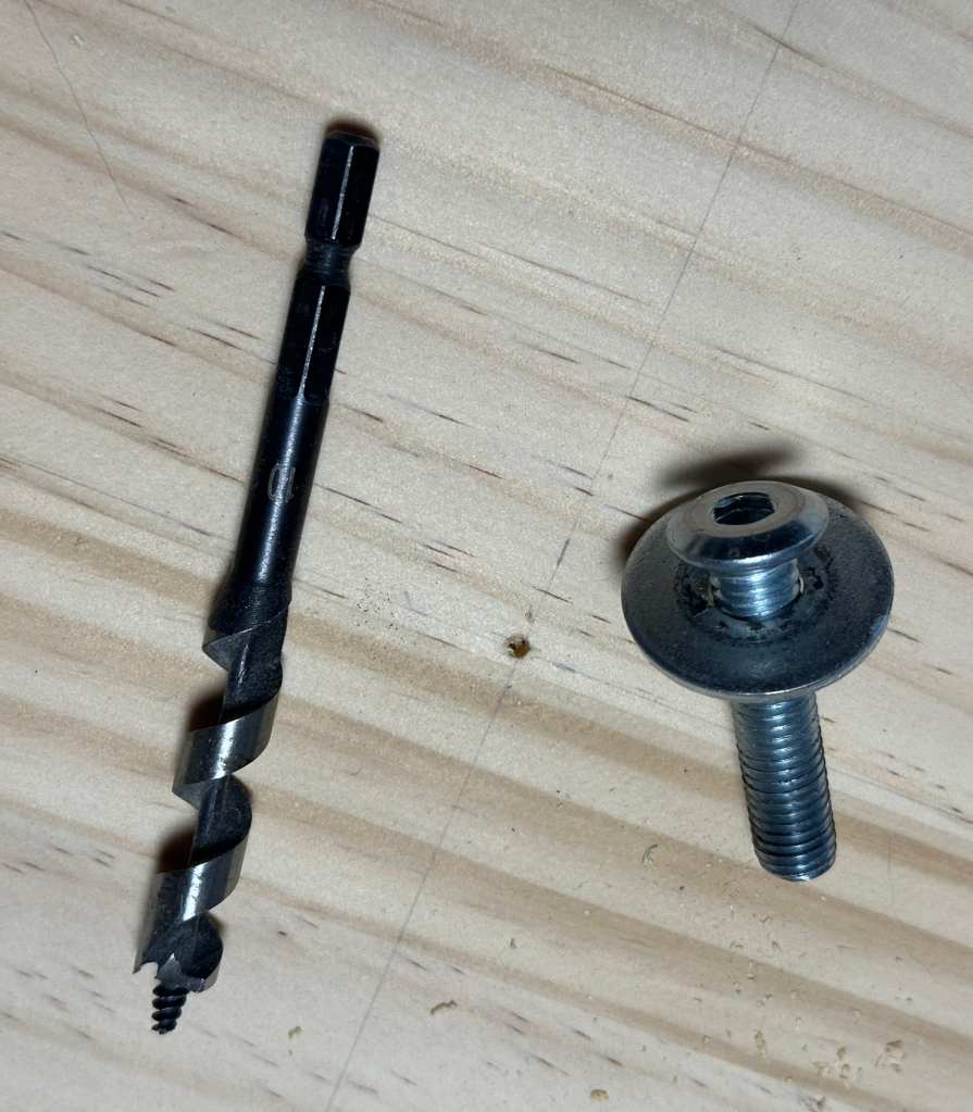 とりあえず35mmのボアビットでネジ頭を隠す数ミリ穴を掘ります。