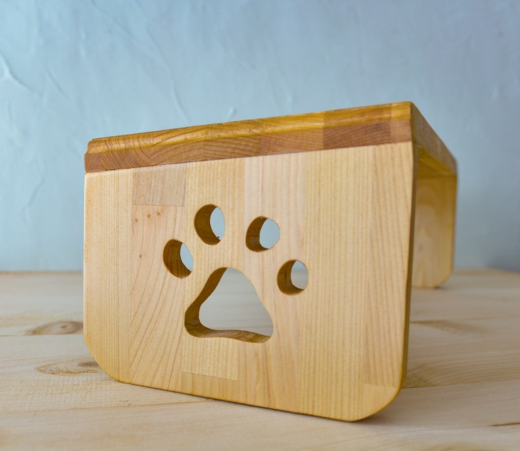 こちらは青森ヒバ材の猫顔のフードスタンドです。