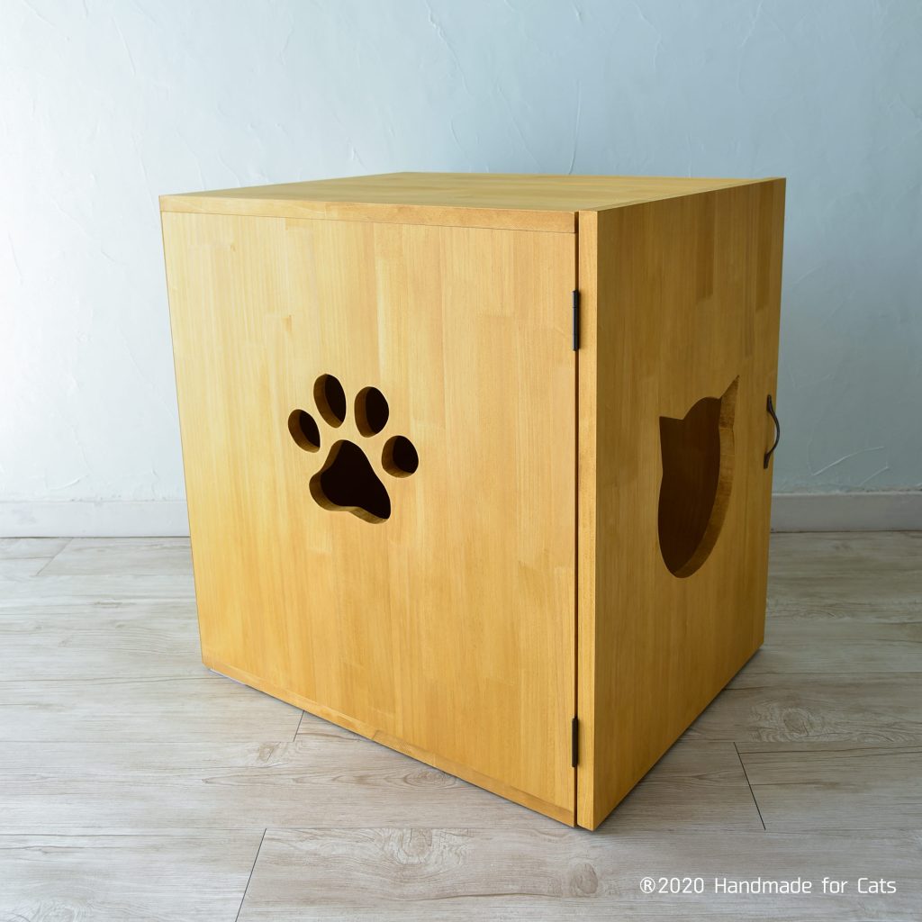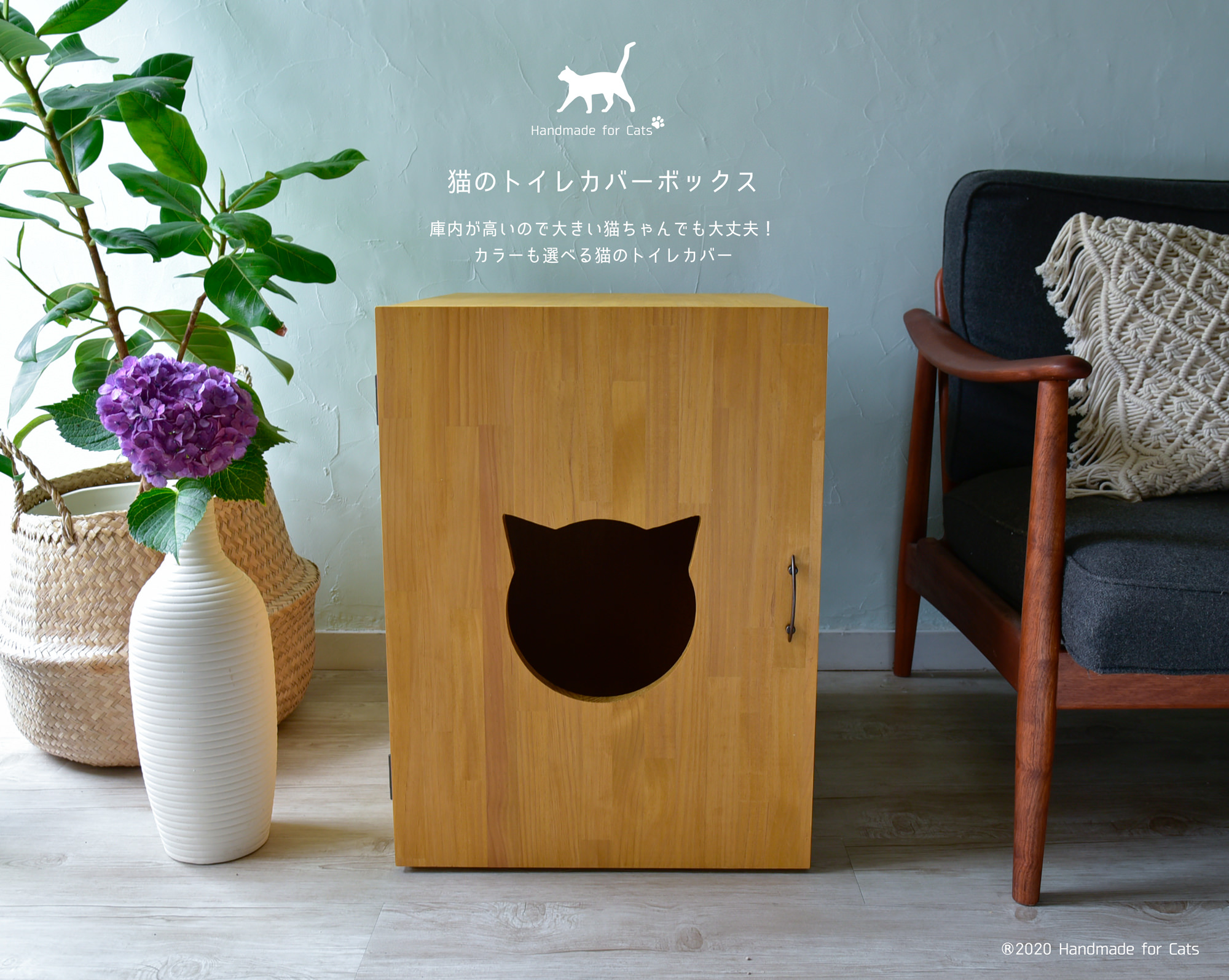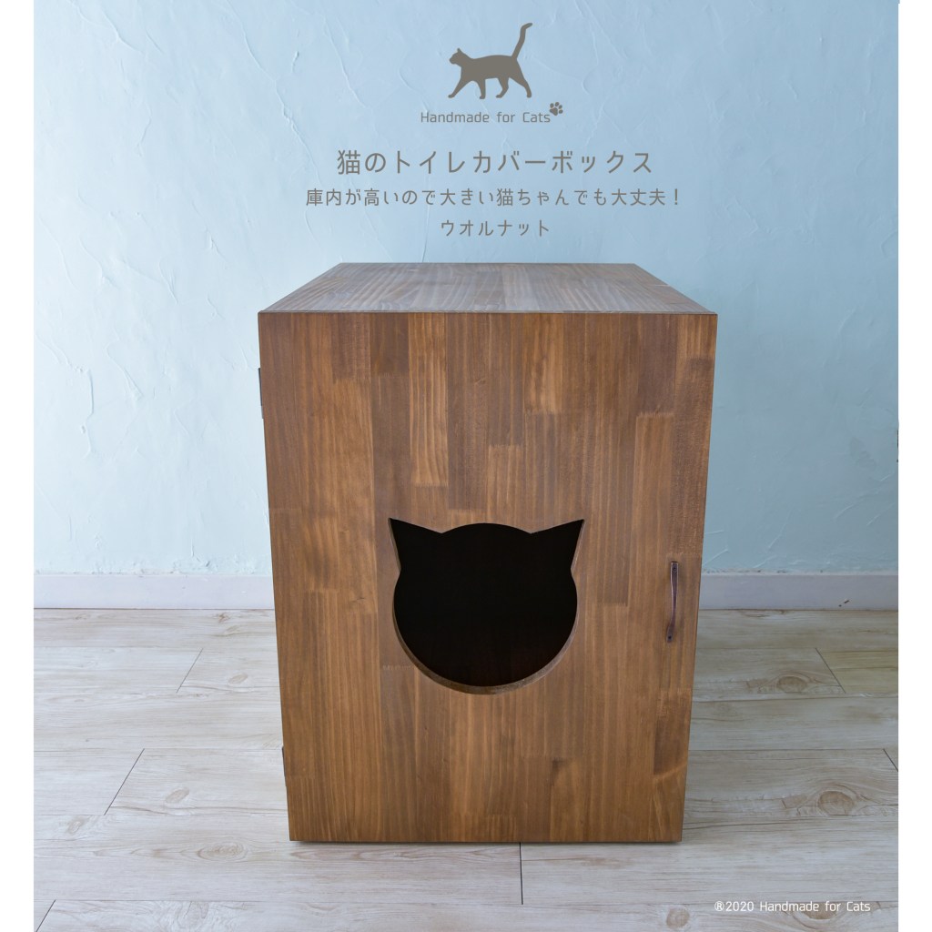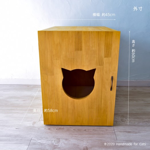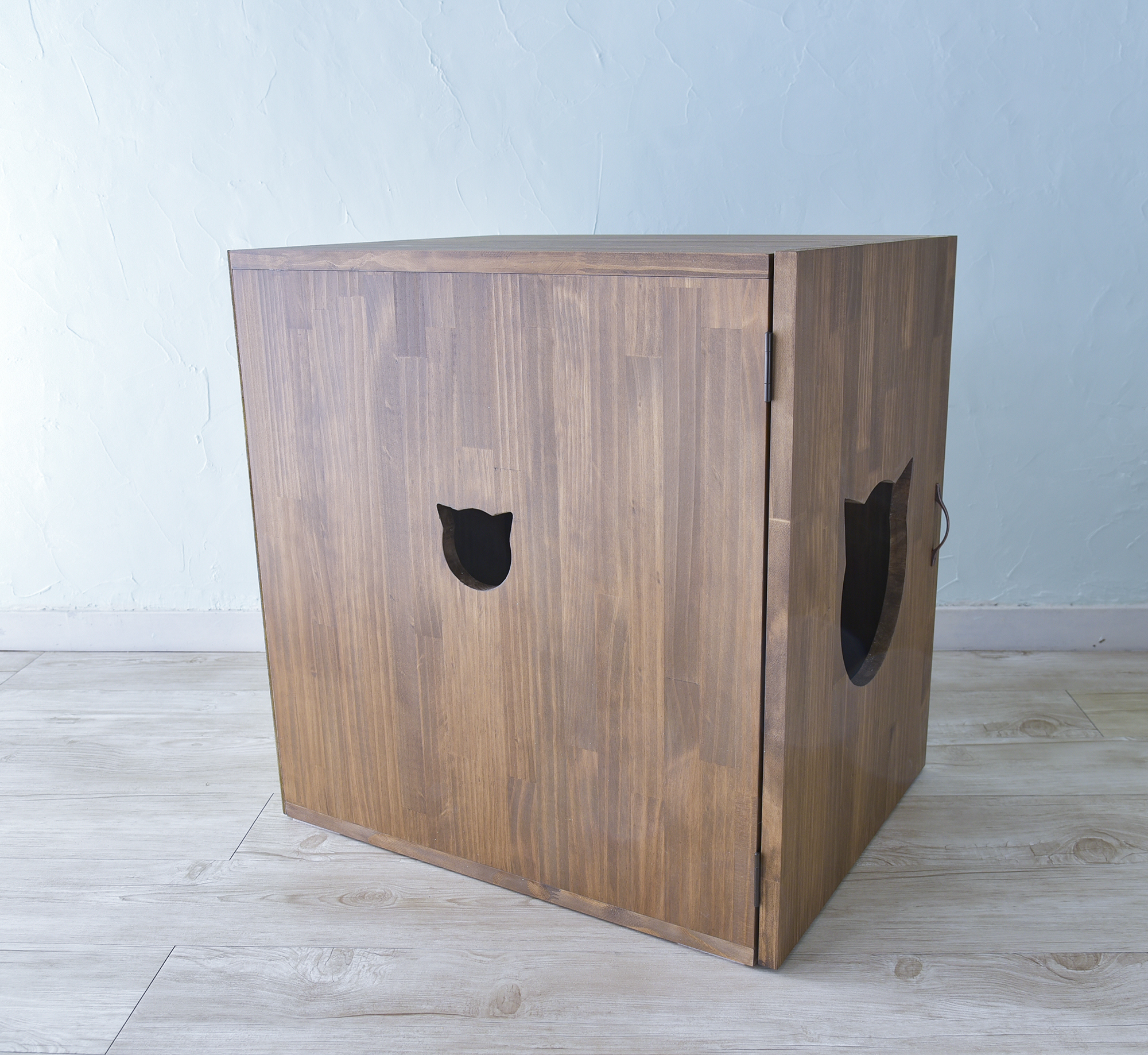 レビューがとんでもなく遅くなってしまい申し訳ございません!! この度は素敵な作品に出会えて感激です(*^_^*) とても猫トイレが入っているとは思えないおしゃれな家具のようで、リビングに置いてもまったく問題ありません。 中のフックにミニほうきと塵取りをセットし、上の棚に必要な小物は全て収まります。 なんて便利なのでしょう( *´艸) 我が家の6.5キロの大きめ猫も、ゆったり使える広さです。 トイレのチップも飛び散りません。 作りもとても丁寧で木の雰囲気も高級感があります。 今後は上に観葉植物など置いてみようかと思っております。 この度は本当にありがとうございました。 猫仲間に自慢のトイレになりました。