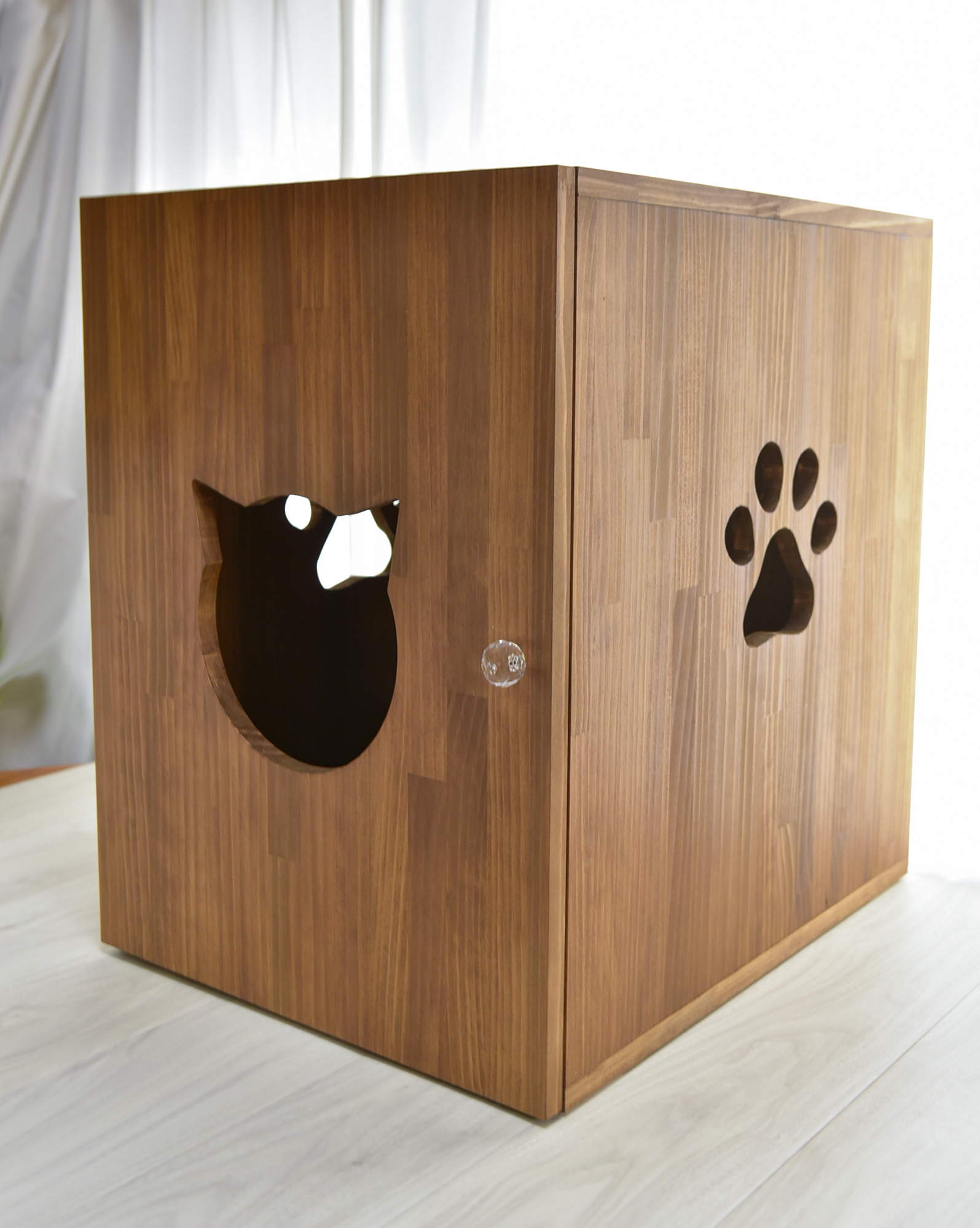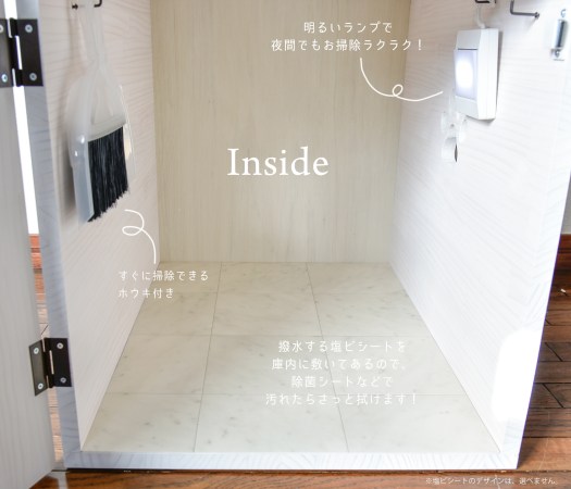 スタイリッシュなデザインだけでなく、床には撥水シートを敷き、庫内が掃除しやすいようにライトも付いて、機能性も抜群です。箱型なので、猫砂の飛び散りを抑え、ニオイも低減できます。