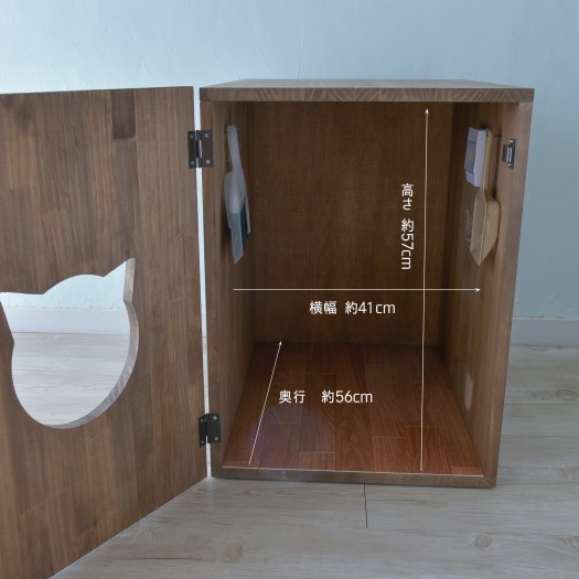 高級感のあるパイン材を使用し、家具としてリビングにも置ける猫のトイレカバーボックス。庫内が57cmあるので、大きい猫ちゃんでも大丈夫な高さになっています。